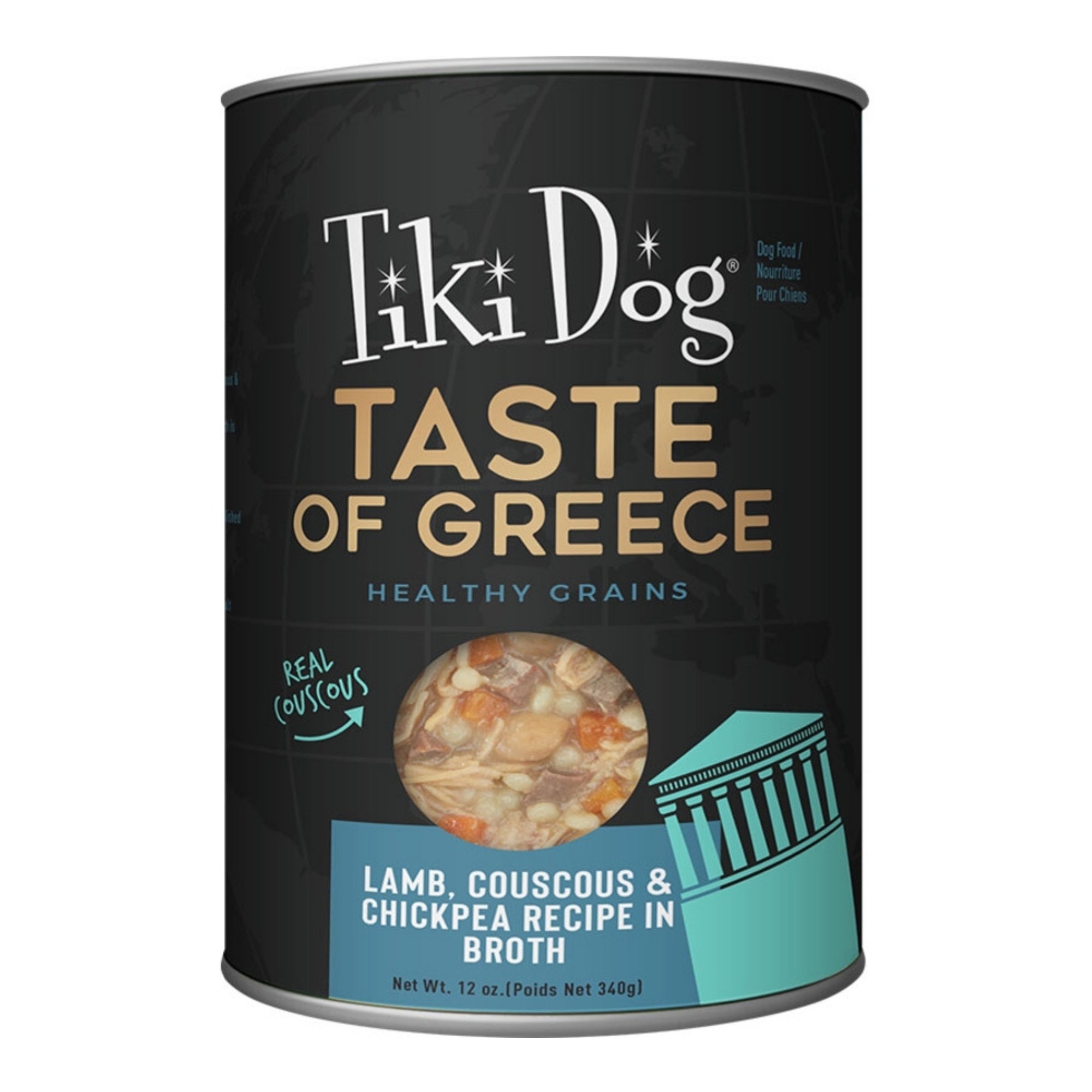 Your dog?s takeout is ready! Tiki Dog? Taste of Greece Lamb, Couscous & Chickpea Recipe is a globally inspired, restaurant-worthy recipe, featuring whole, recognizable ingredients ? like, real lamb, chicken, couscous, chickpeas and carrots in a savory broth. It looks good enough to be on YOUR menu!