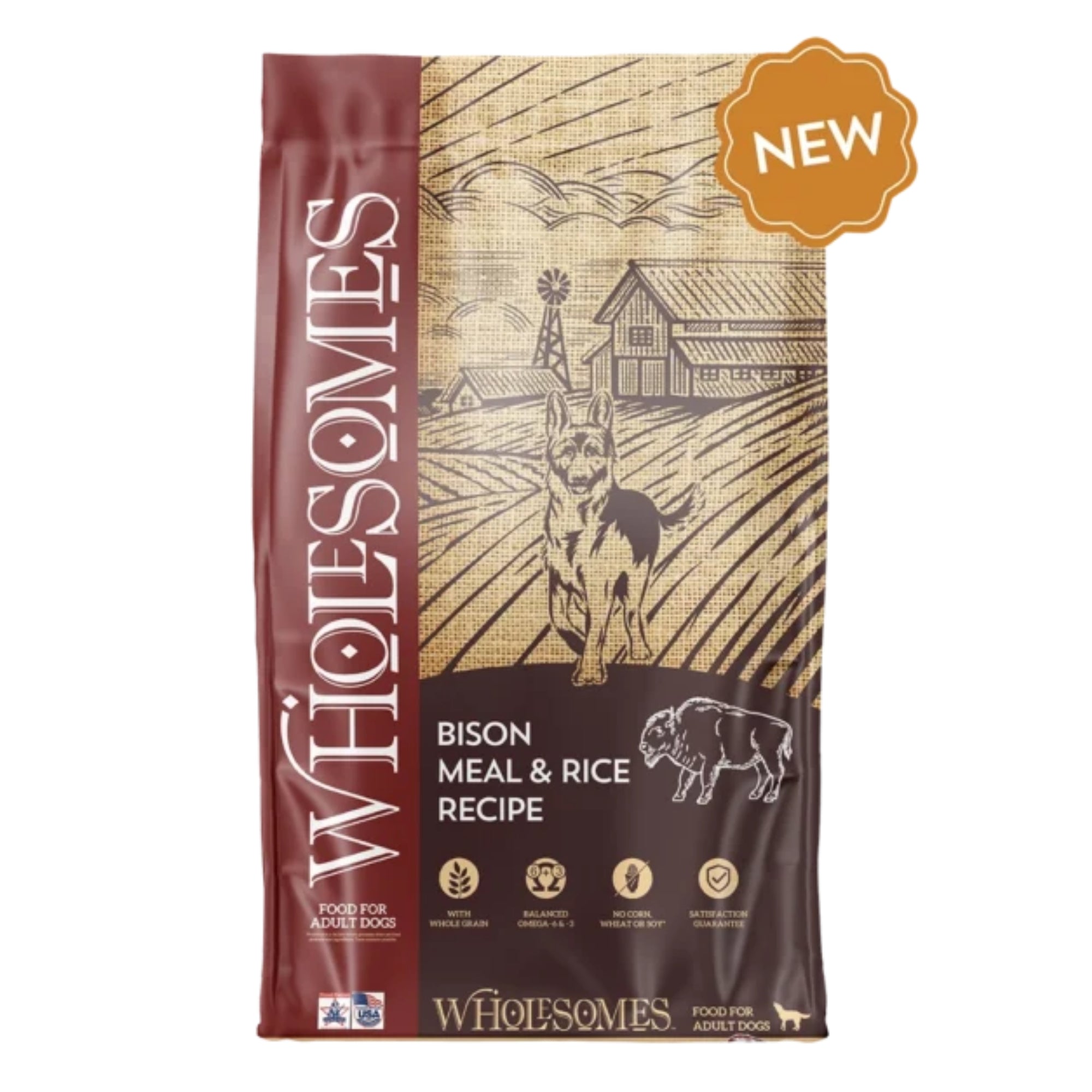 Wholesomes Bison Meal & Rice Recipe offers lean red meat as the principal source of protein. Bison Meal & Rice is made without high-moisture protein sources or common grains like corn, wheat or soy. Nutritionally balanced Omega-6 & Omega-3 fatty acids help promote healthy skin & hair coat. The addition of vegetable fibers helps support good digestion. Bison Meal & Rice supplies your dog with a 100% complete & balanced diet for a healthy active life.
